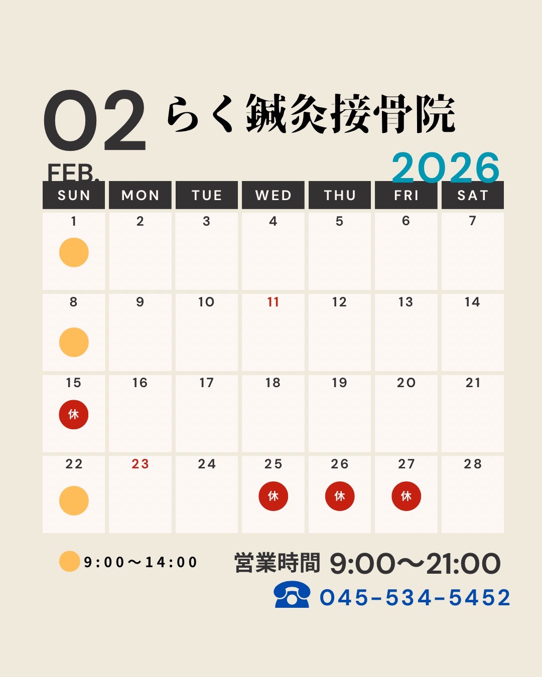 2月のカレンダーとなります。