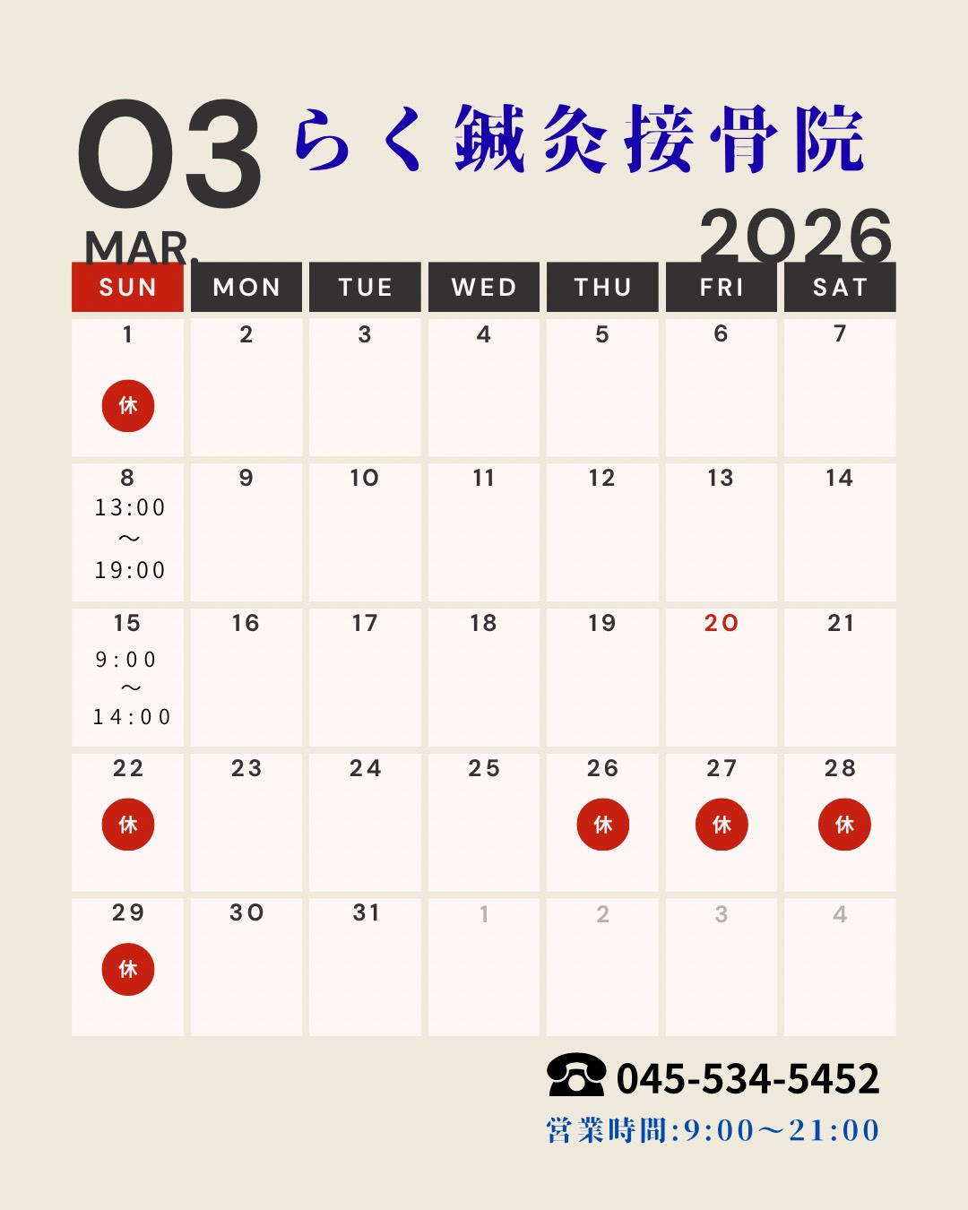 3月のカレンダー 2026.03.07 LINE note おはようございます。 らく鍼灸接骨院の久木田です。 遅くなりましたが、 3月のカレンダーとなります。 1、22、26、27、28日は、 休診となります。 日曜診療は、 8日 13:00〜19:00 15日 9:00~14:00 までとなります。 寒暖差が激しいです。 体調に十分気を付けましょう! Post Share Hatena LINE RSS feedly Pin it note この記事のタイトルとURLをコピーする 今週のお知らせ 前の記事